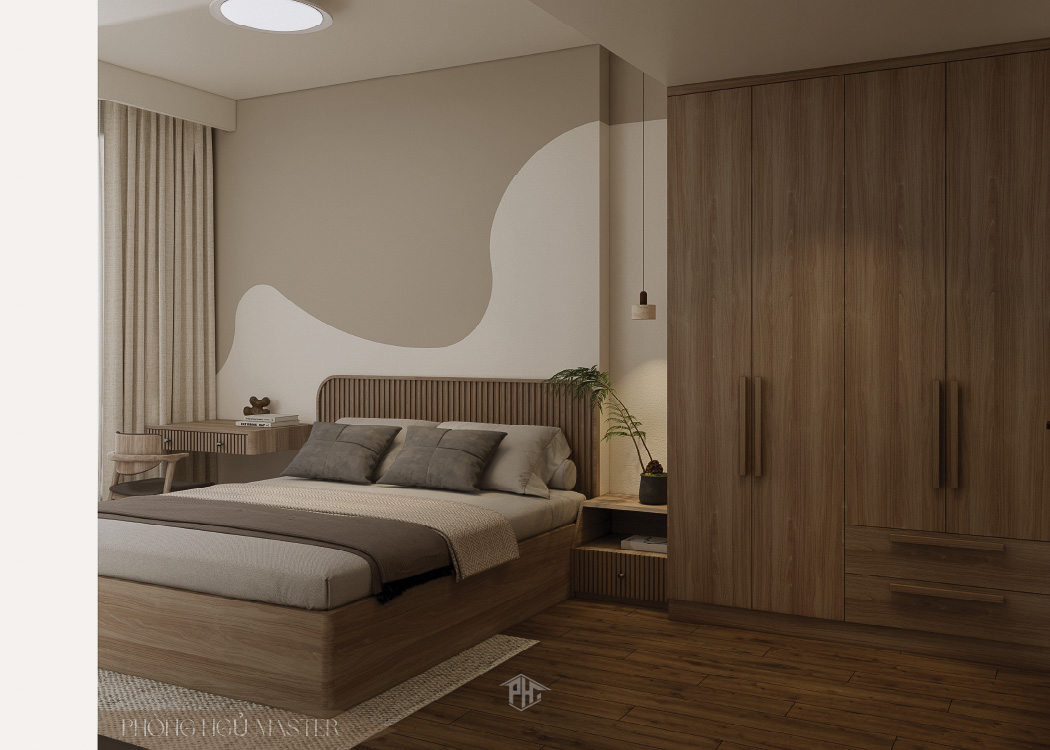 Phòng ngủ chính được thiết kế hướng đến sự thoải mái, riêng tư, tạo cảm giác thư giãn sau ngày dài làm việc.