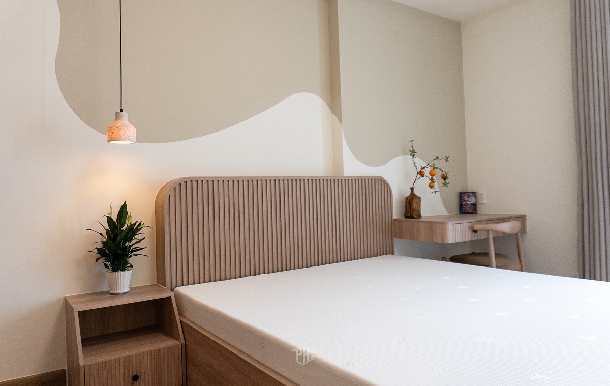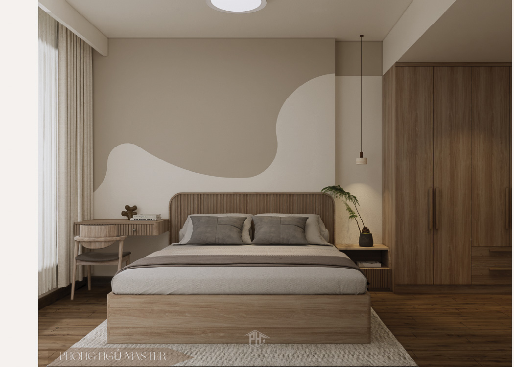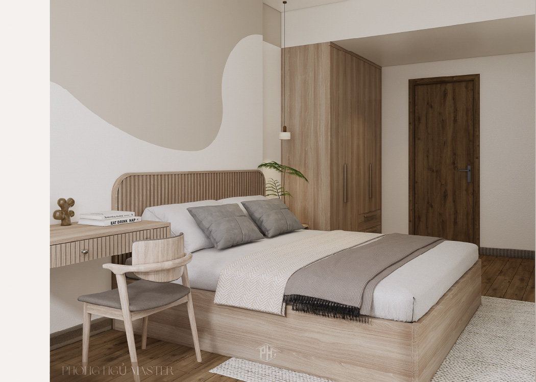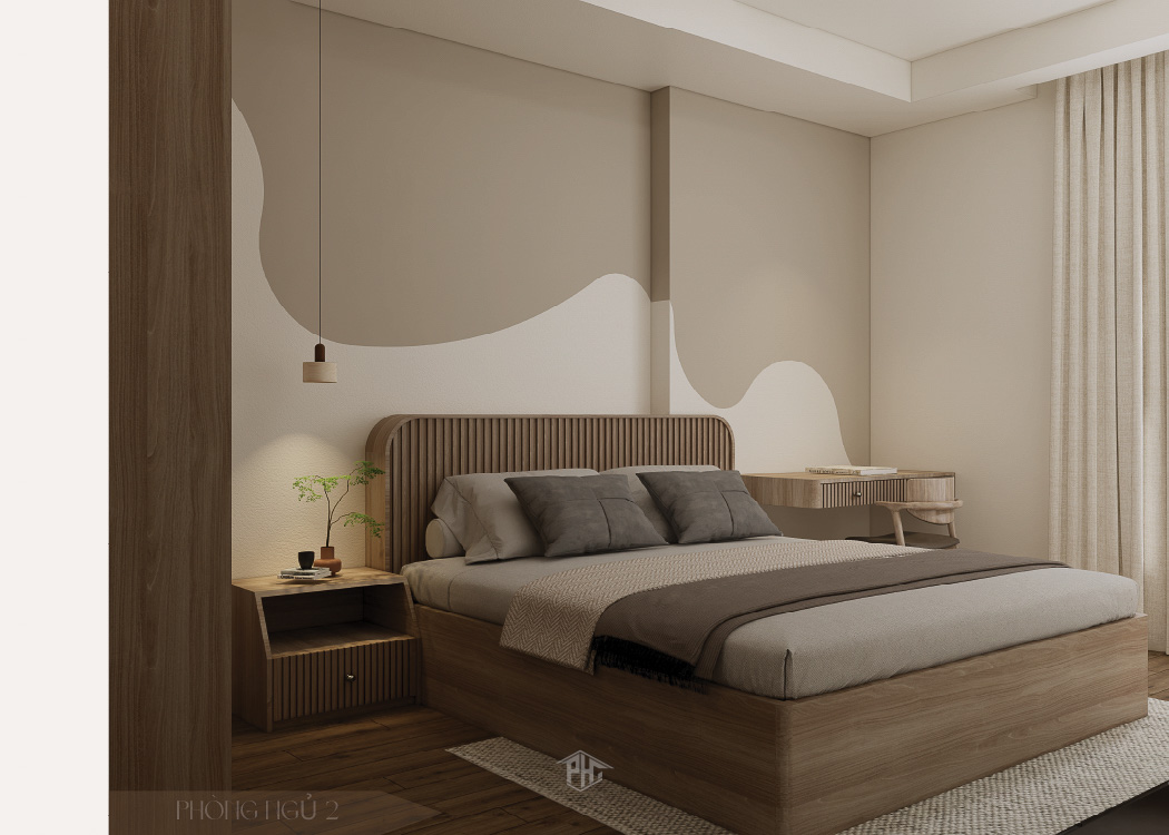 Giường ngủ: giường gỗ tự nhiên, thiết kế thấp, mang lại cảm giác chắc chắn và hiện đại.