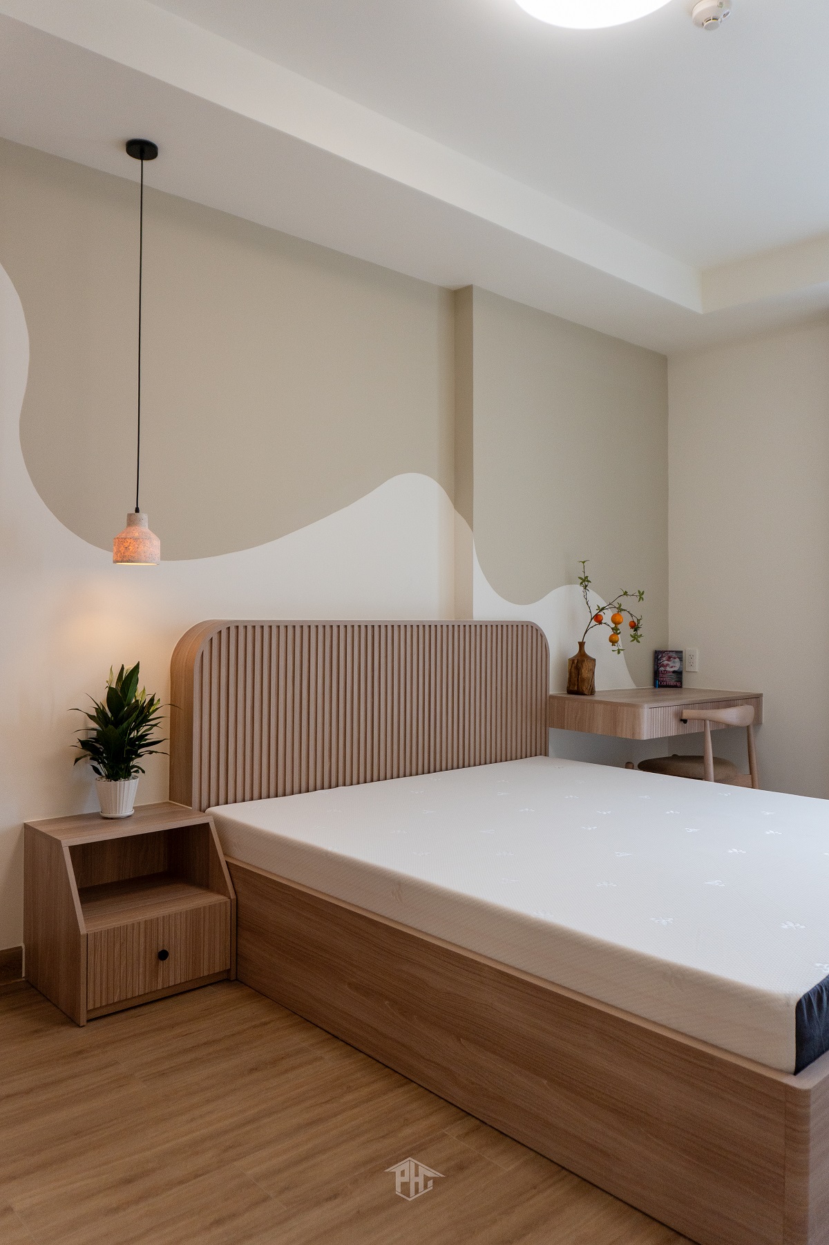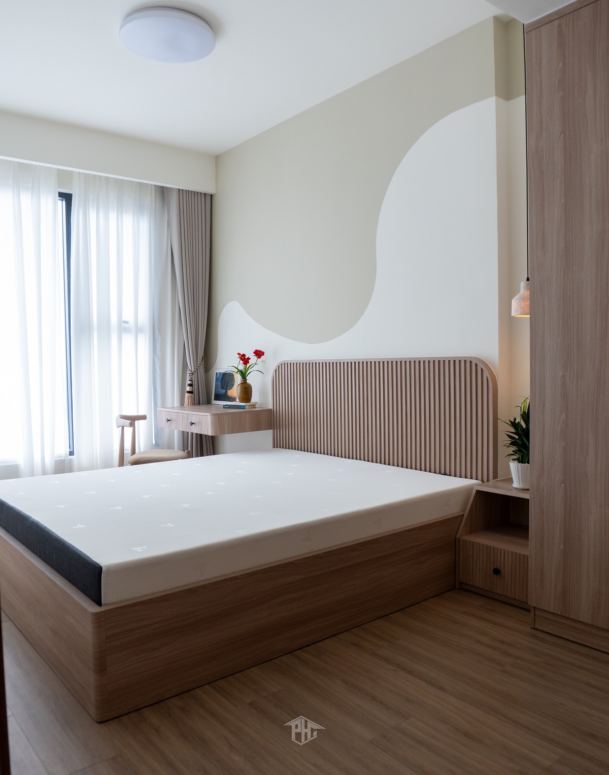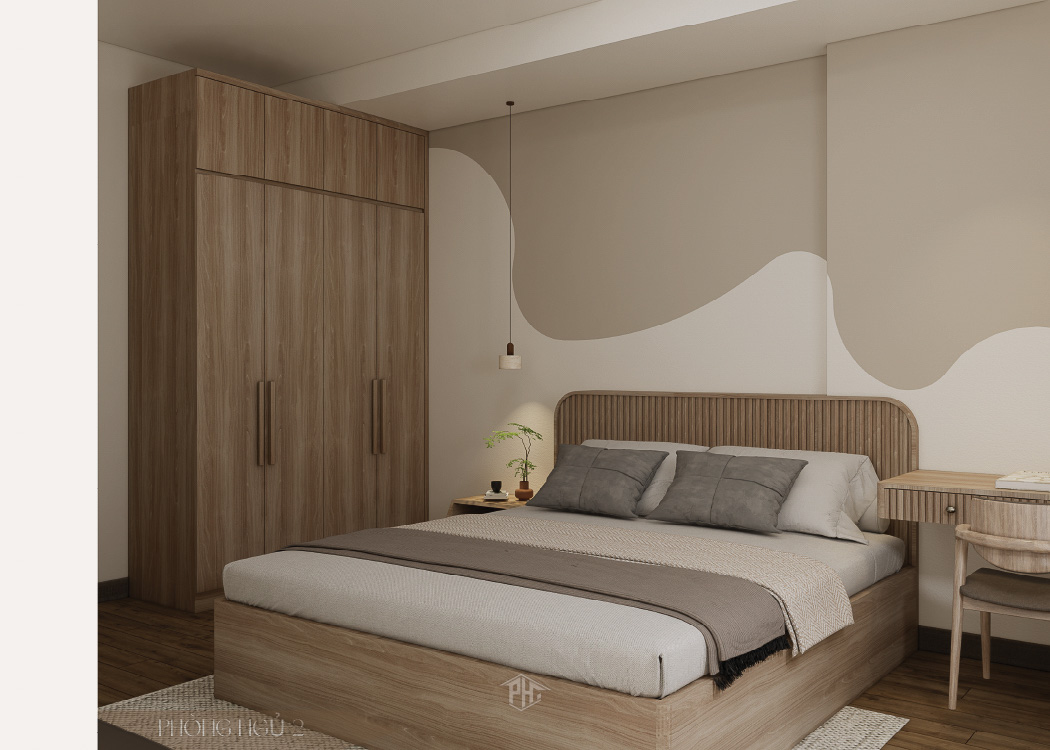 Giường ngủ: giường gỗ tự nhiên, thiết kế thấp, mang lại cảm giác chắc chắn và hiện đại.