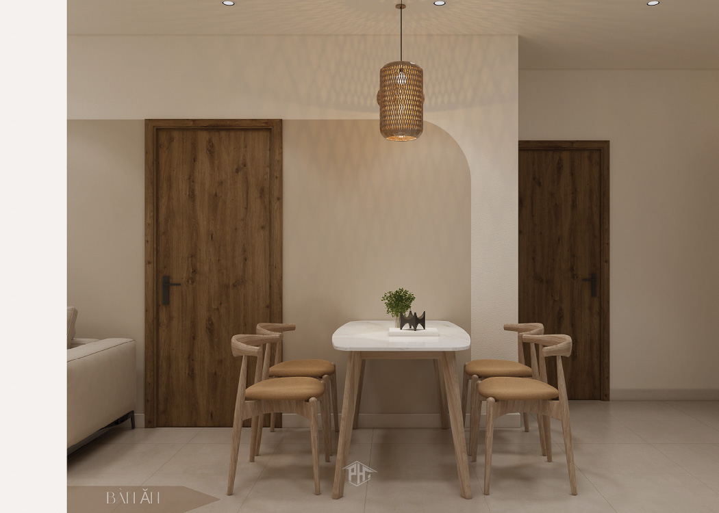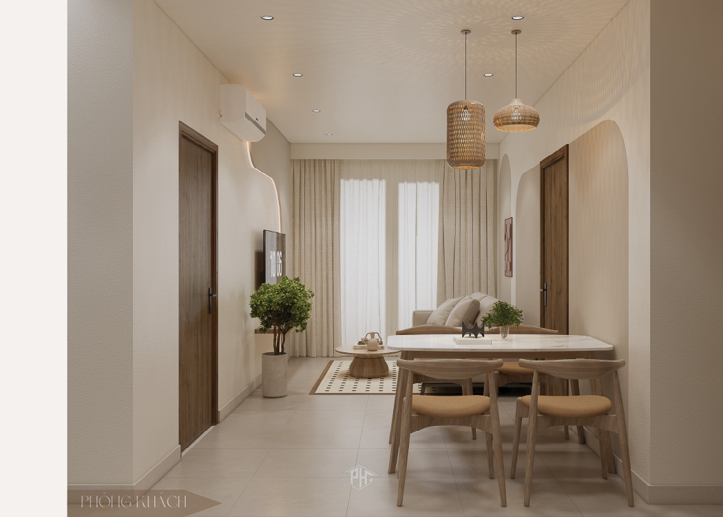 Điểm nhấn: đèn thả trần mây tre đan, cây xanh nội thất, thảm trải sàn trung tính tạo sự mềm mại và tăng chiều sâu thị giác.