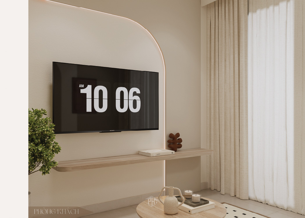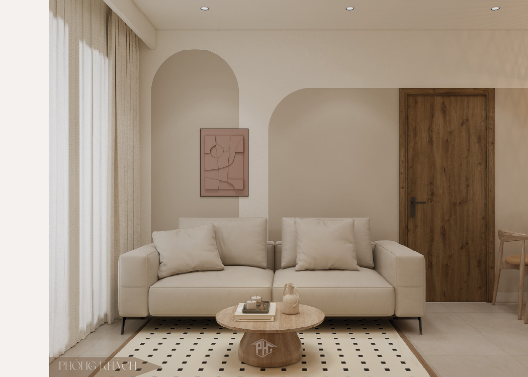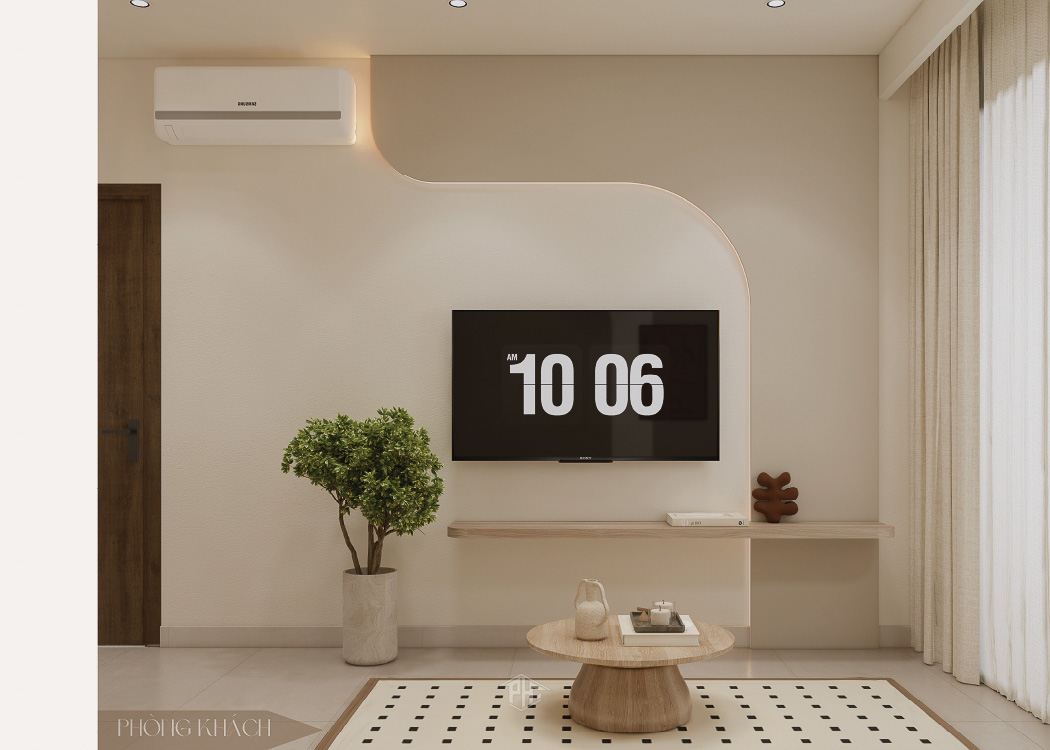 Nội thất chính: sofa chữ I gọn gàng, bàn trà tròn thấp, kệ tivi tối giản. Cửa sổ lớn với rèm hai lớp (voan và vải dày) mang lại ánh sáng tự nhiên và dễ điều chỉnh độ sáng.