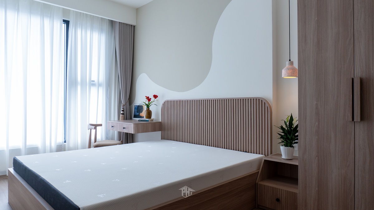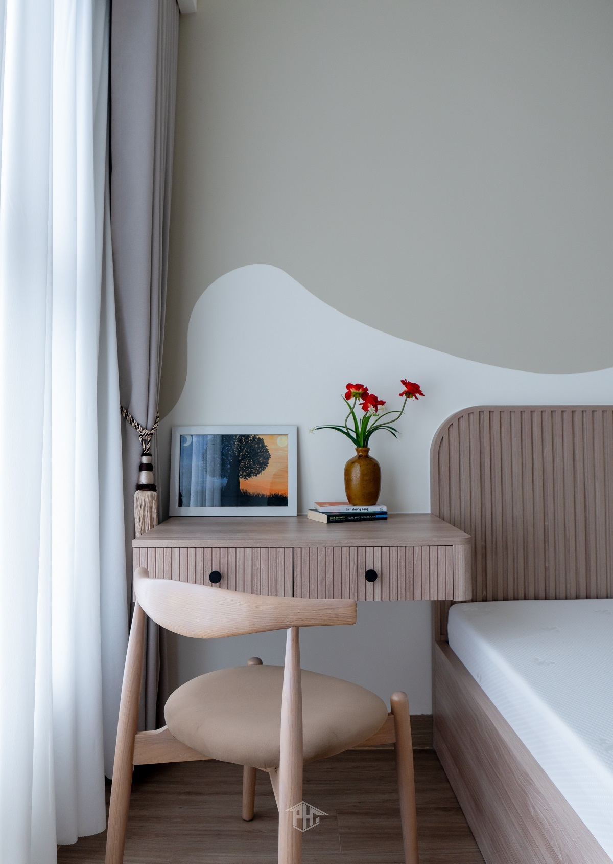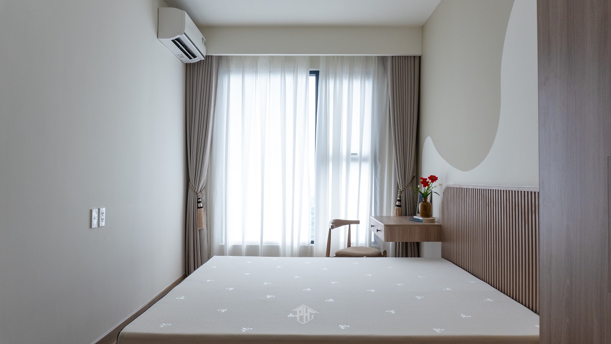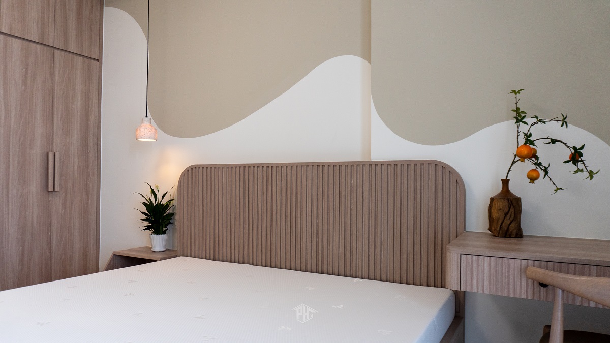 Màu sắc: gam màu be – trắng chủ đạo kết hợp nội thất gỗ sáng màu, giúp căn phòng vừa hiện đại vừa ấm áp.