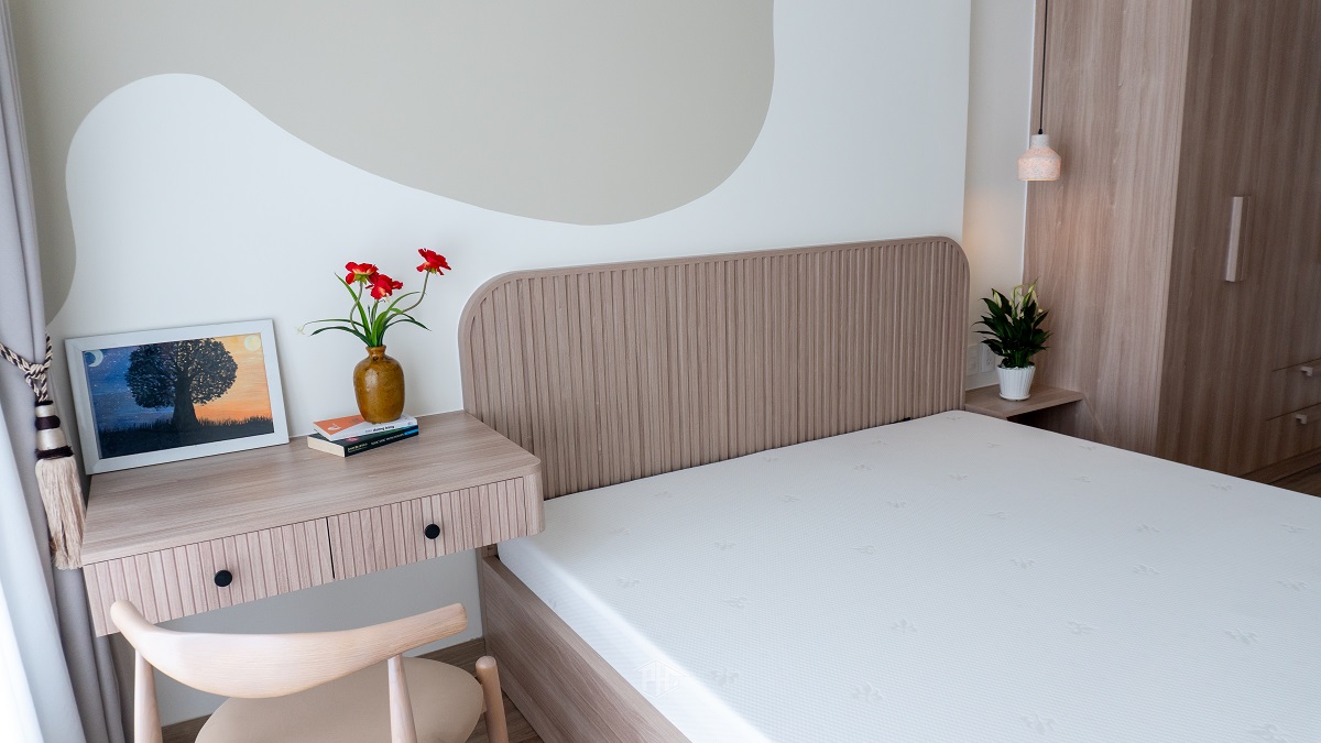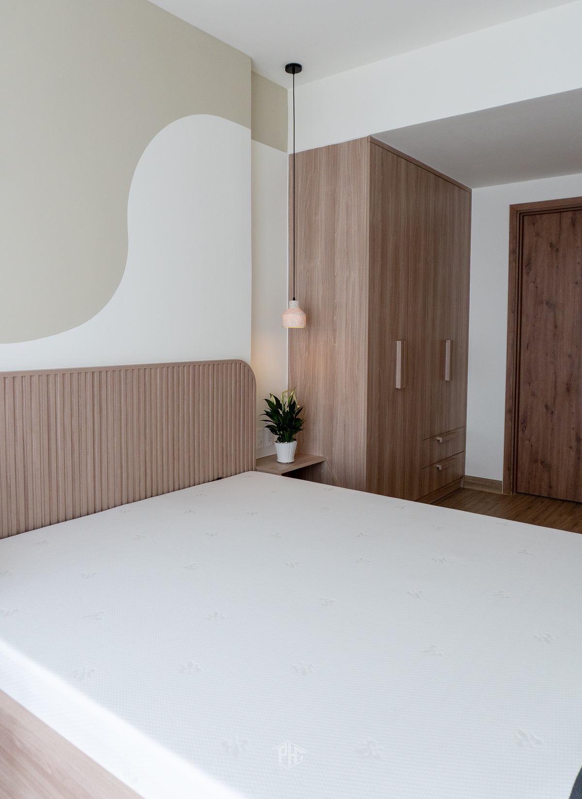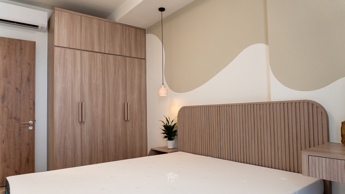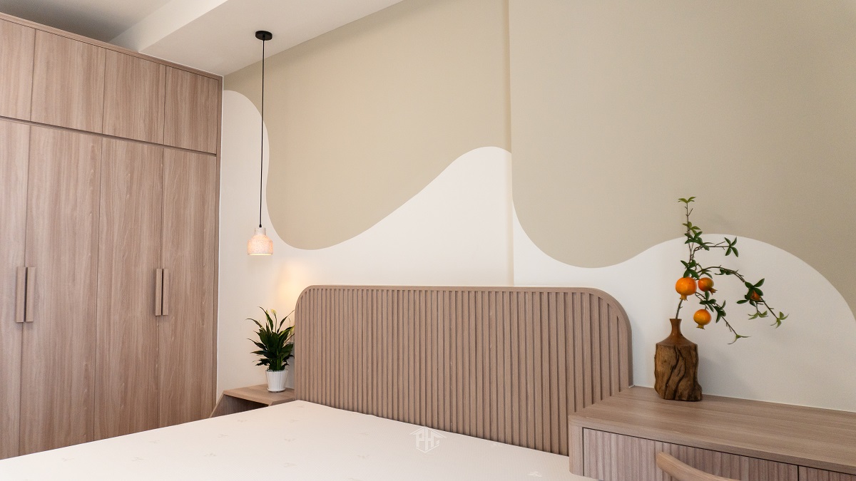 Màu sắc: gam màu be – trắng chủ đạo kết hợp nội thất gỗ sáng màu, giúp căn phòng vừa hiện đại vừa ấm áp.