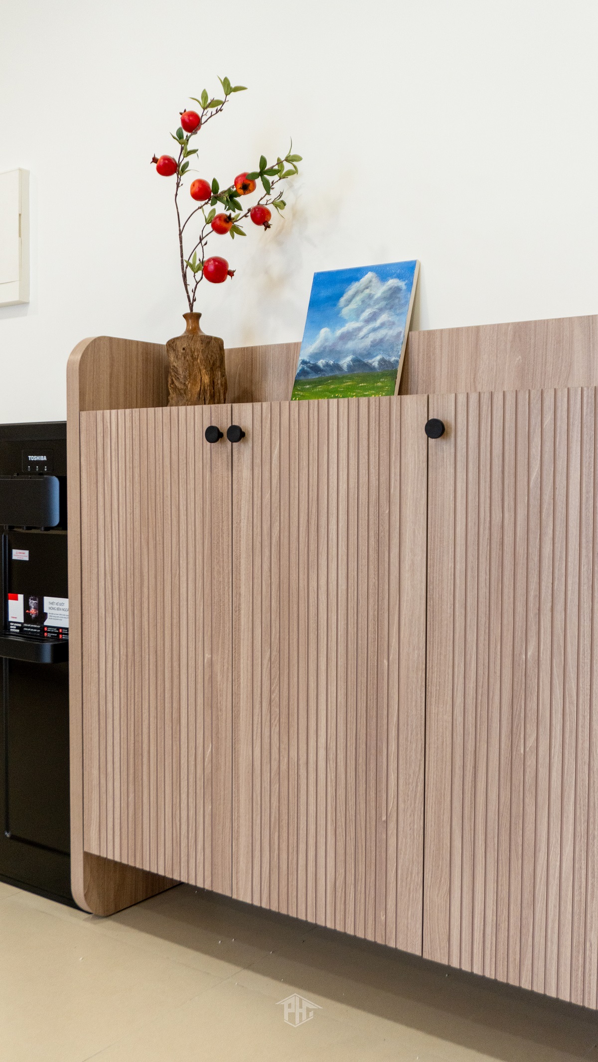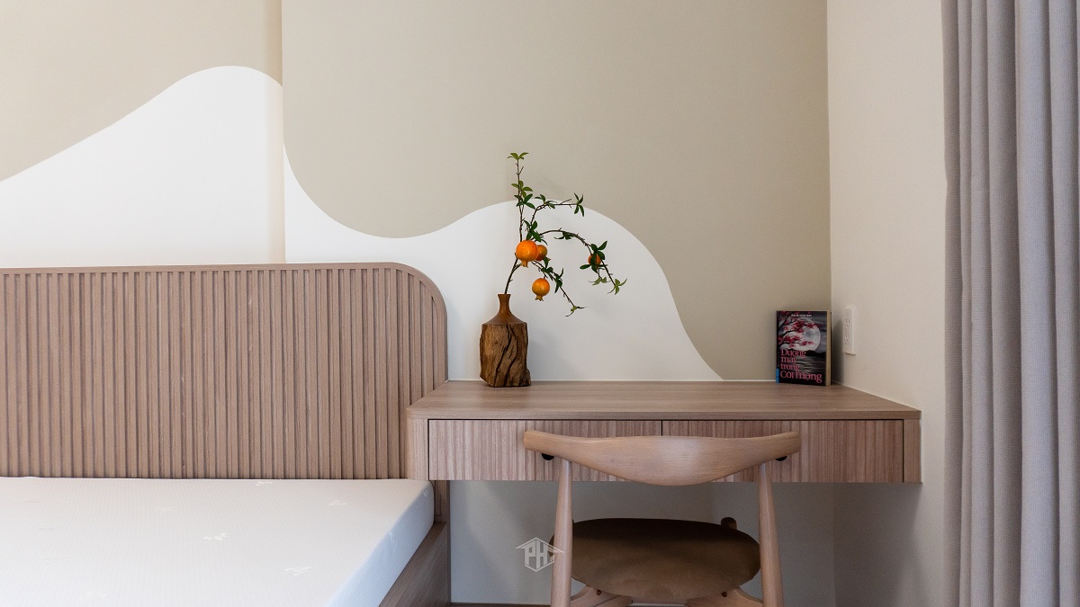 Màu sắc: vẫn giữ tone trung tính đồng bộ với tổng thể căn hộ, nhưng thêm điểm nhấn bằng các chi tiết trang trí như kệ sách, tranh canvas.