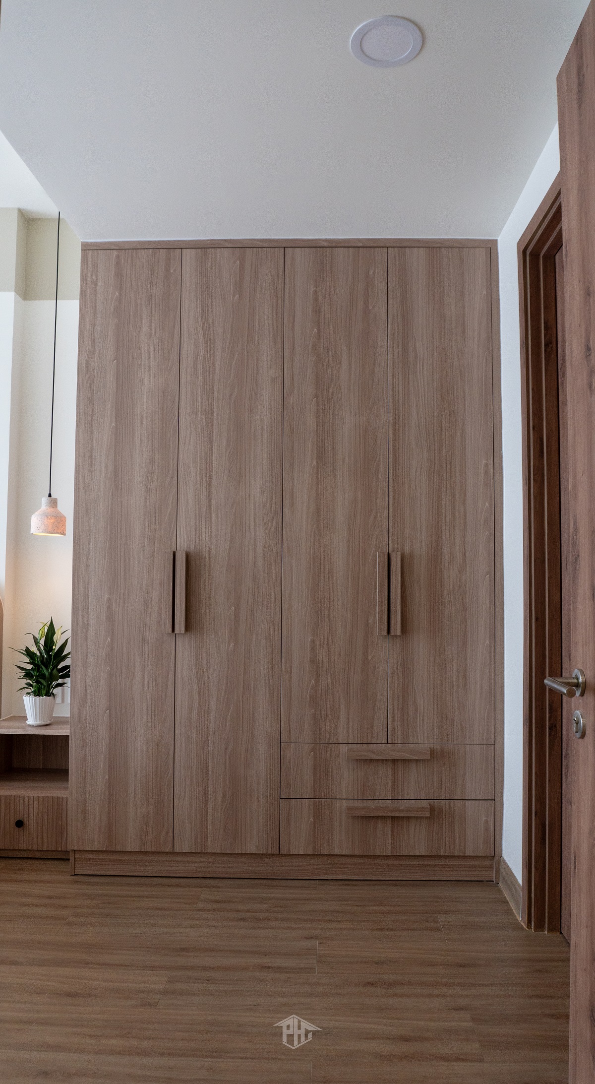 Tủ quần áo: cửa mở để tiết kiệm chi phí, bề mặt phủ melamine vân gỗ.