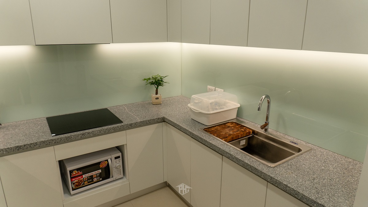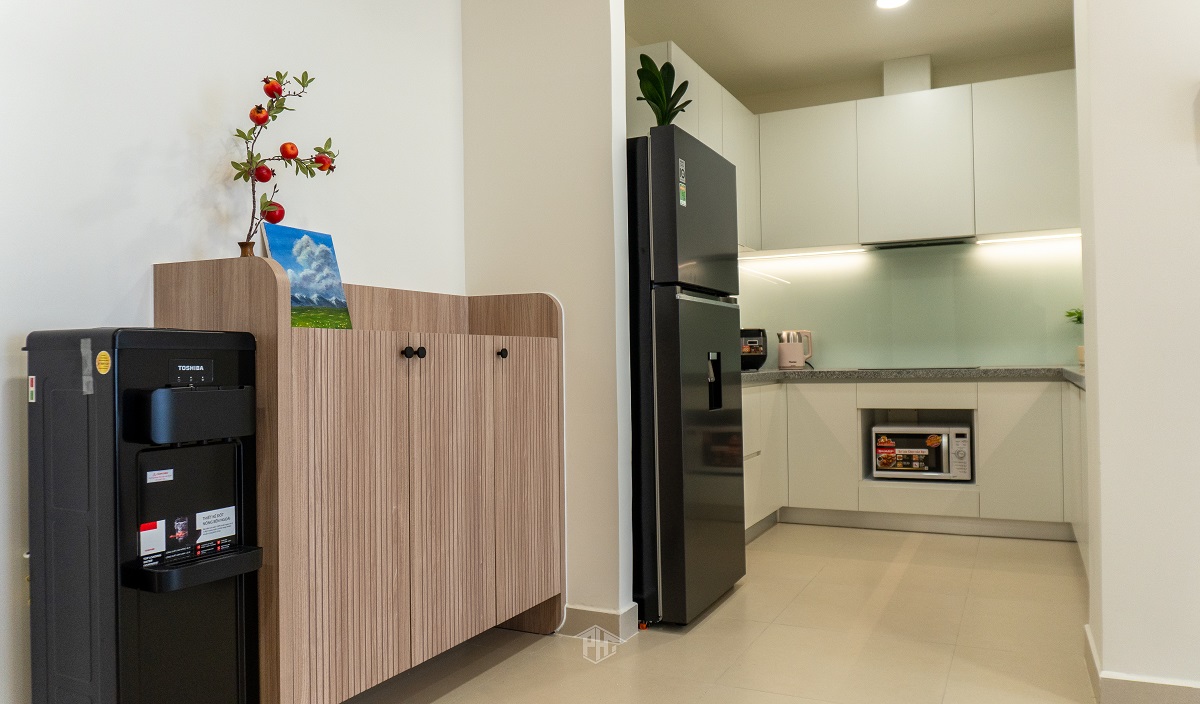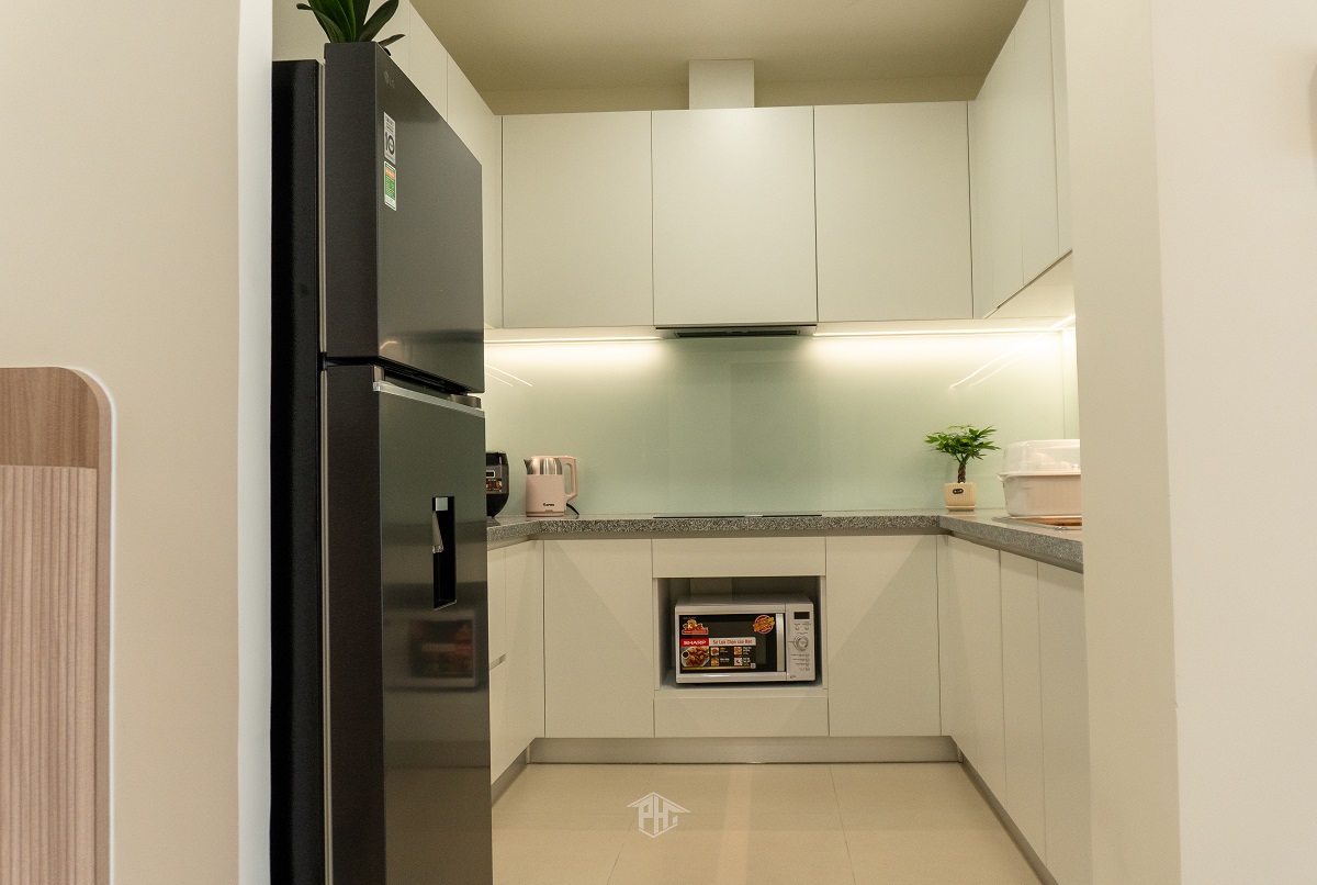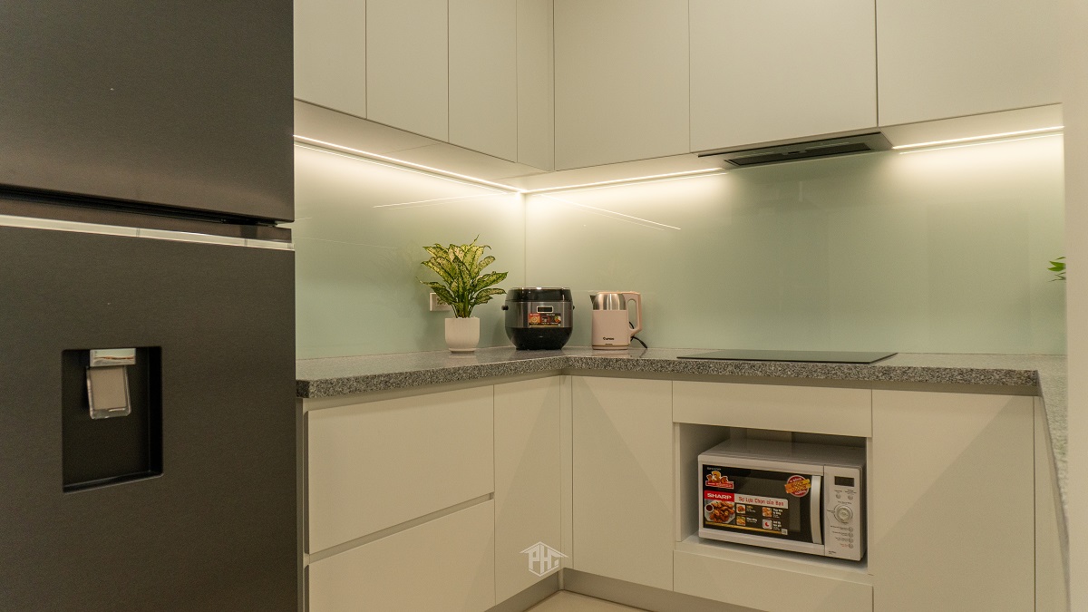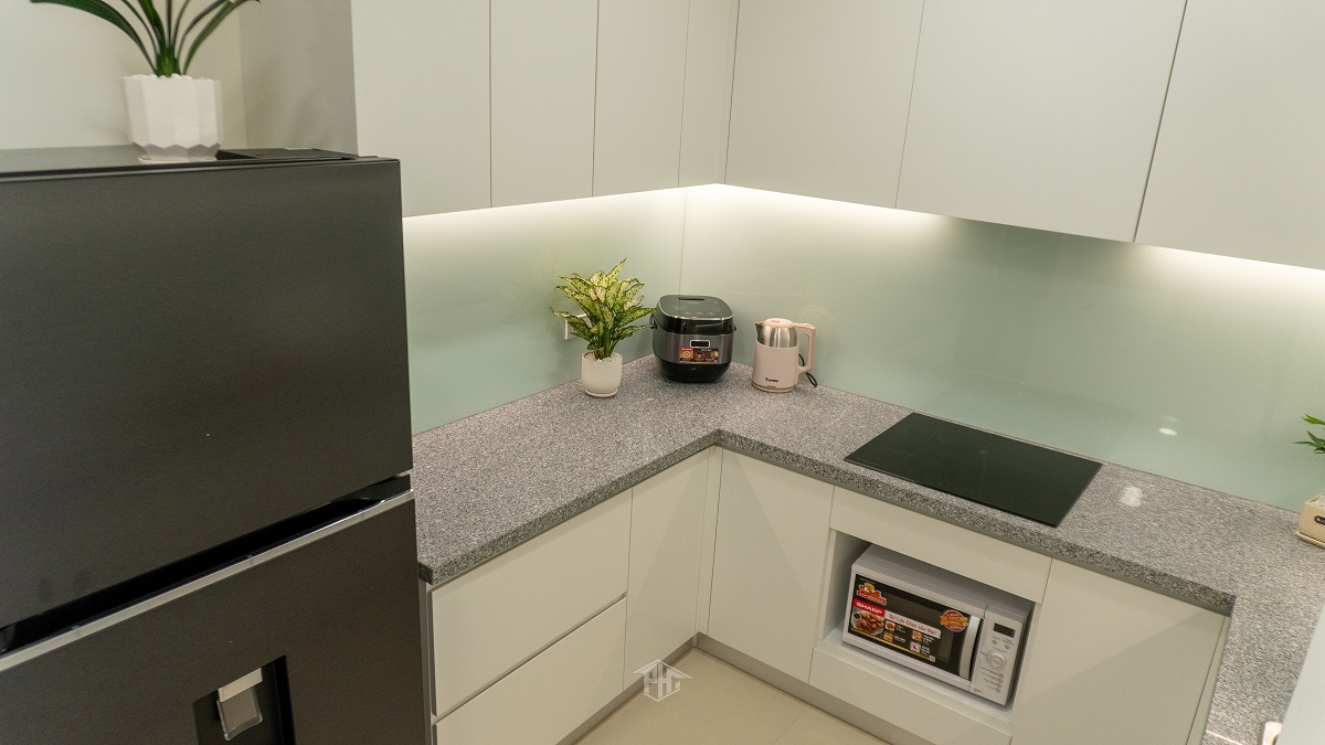 Thiết bị: bếp điện âm, máy hút mùi nhỏ gọn, tủ lạnh âm tường giúp không gian gọn gàng.