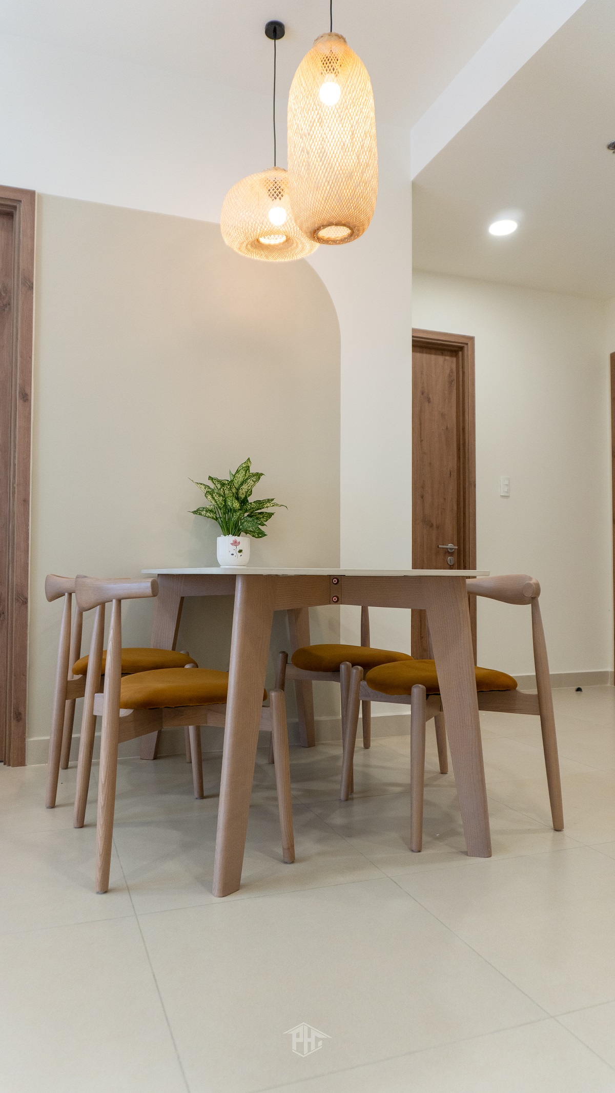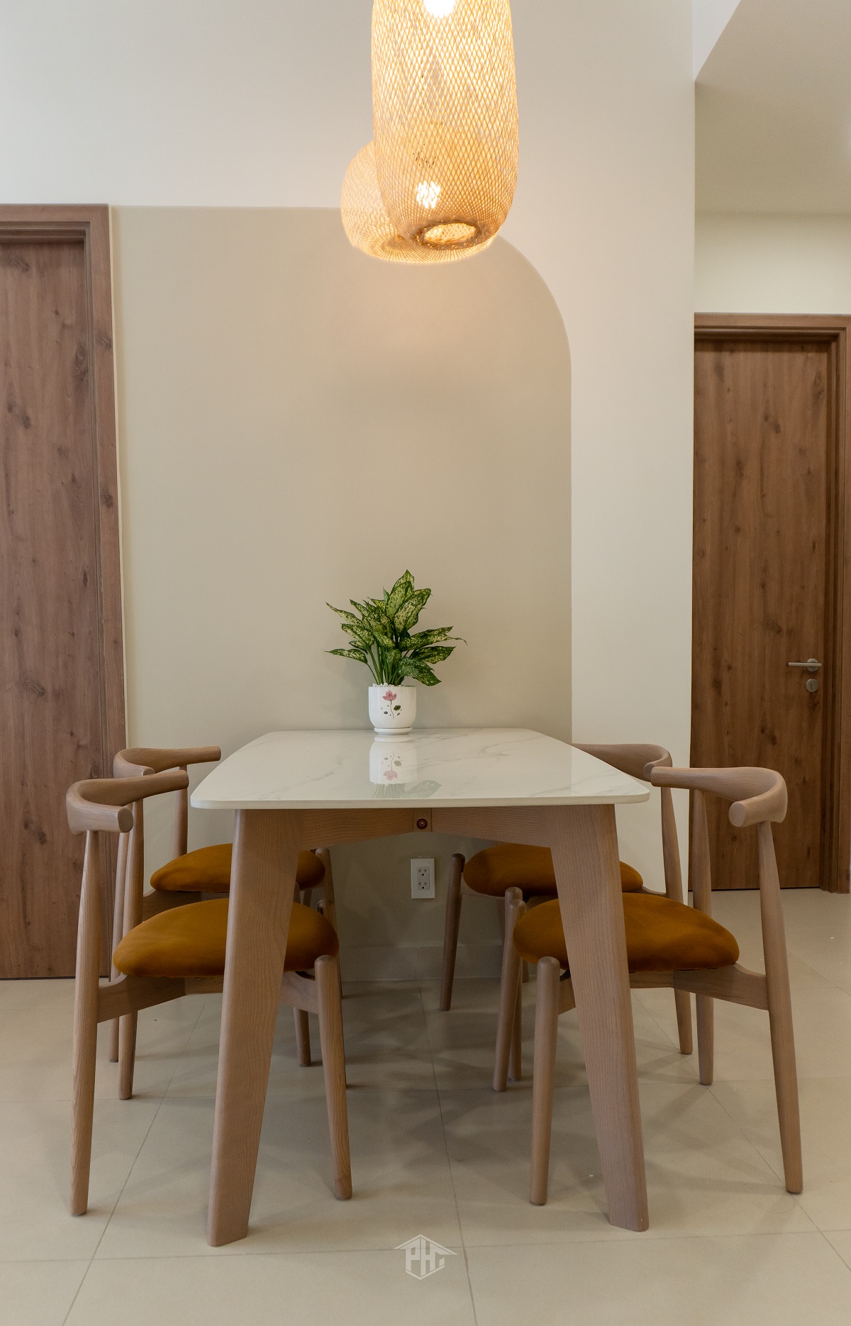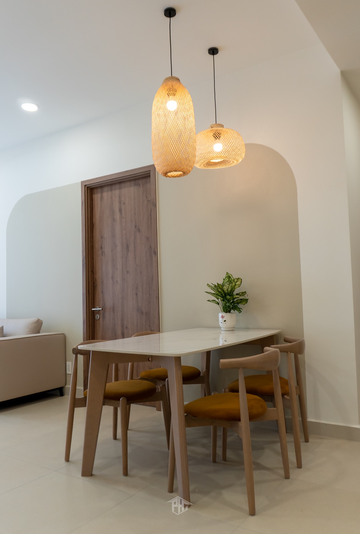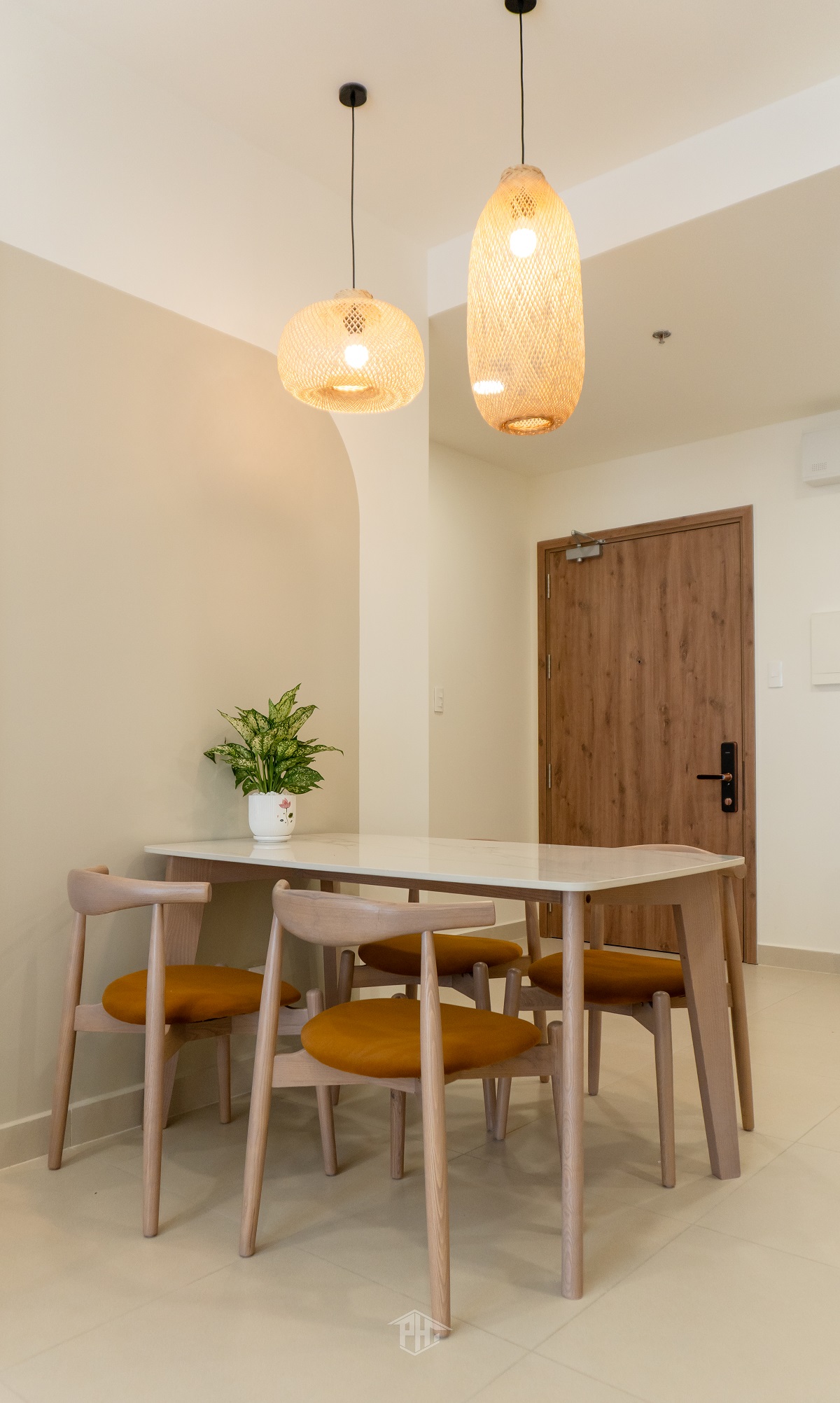 Các không gian được sắp xếp hợp lý, ưu tiên ánh sáng tự nhiên và các chi tiết nhỏ như đèn treo, giấy dán tường, cây xanh để tăng sự mềm mại và tạo điểm nhấn cho căn hộ.