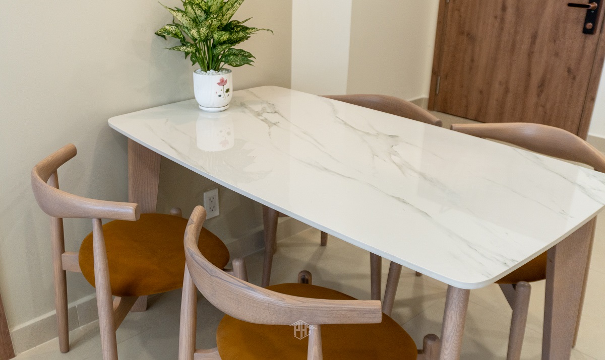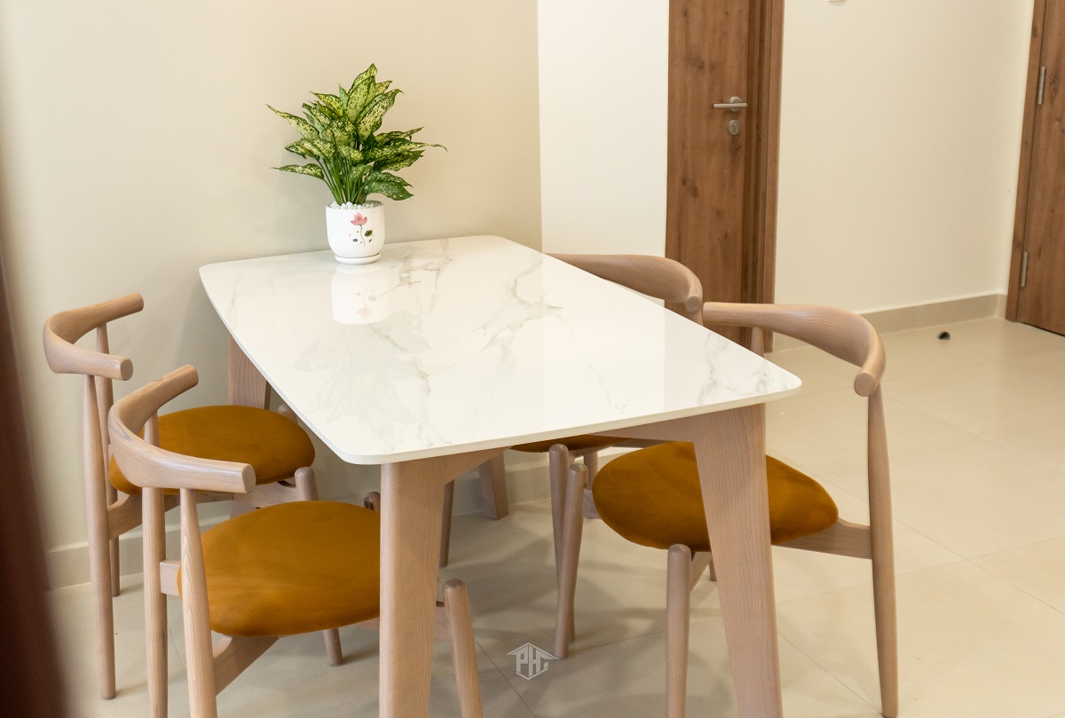Bàn ăn: thiết kế sát không gian phòng khách, dành cho 4 người. Bàn gỗ kết hợp ghế tựa bọc nệm mỏng, vừa thoải mái vừa tiết kiệm diện tích.